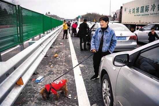 19日11时,京港澳高速粤北段出现拥堵,有乘客下车遛狗 羊城晚报记者 周巍