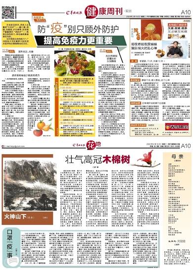 走在岭南的大街小巷,随处可见高大的木棉树安静地站立在你的身旁,默默陪伴你度过日日夜夜。有近年栽种的英俊如少年,有多年生长的刚健似壮汉,有百年孕育的苍劲若长者,它们承接日光风雨,历经岁月变迁,毅然守护一方天地。岭南种植木棉树的历史记载最早见于晋葛洪辑抄的《西京杂记》卷一:“汉积草池中有珊瑚树,高一丈二尺,一木三柯,上有四百六十二条。是南越王赵佗所献,号为烽火树。至夜,光景常欲燃。”因此卷为历史笔记小说集所记难以确信,且长安城冬日冰天雪地,这种生长在热带亚热带的树木恐难以存活。我在秦地数年,未见有木棉生长,后移居岭南方初识木棉。又据南宋方信孺著《南海百咏》记载:“为踏青避暑之胜地。……列植木棉、刺桐诸木,花敷殷艳,十里相望如火。”这大概是岭南种植木棉的最早的明确记载。