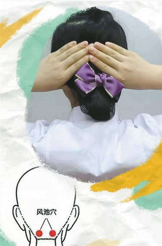 鸣天鼓:此导引术可调动督脉之阳气,同时祛风散寒。具体方法为:以双手紧捂双耳,将食指与中指重叠后敲击后脑的风池穴,或直接以四指同时轻拍风池与风府穴。每次轻敲24下。