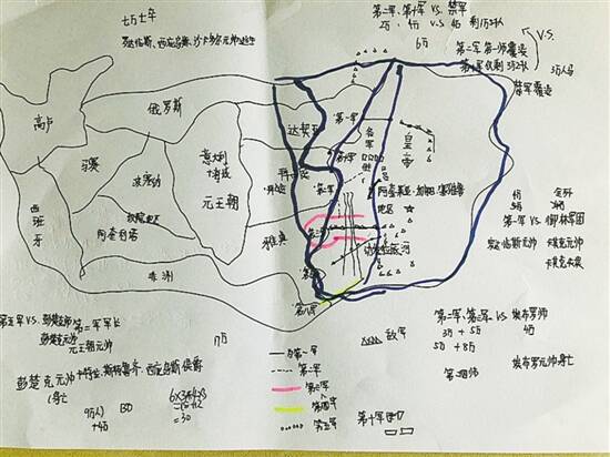 画地图是周炫桦自创的记忆和理解历史的一种方式,“让拿破仑的一众大将、元帅在欧洲各个战场叱咤风云,攻占维也纳的时候,心里也不由自主地高兴。学中玩,玩中学。”他时常将自己想象成历史事件中有影响的人物,例如拿破仑怎样攻破巴黎。