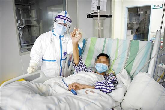 ICU病房里患者转出前,集体向广东医疗队队员竖起大拇指,一位82岁的女性患者拍着自己胸口说:“广东医生好,安心!”