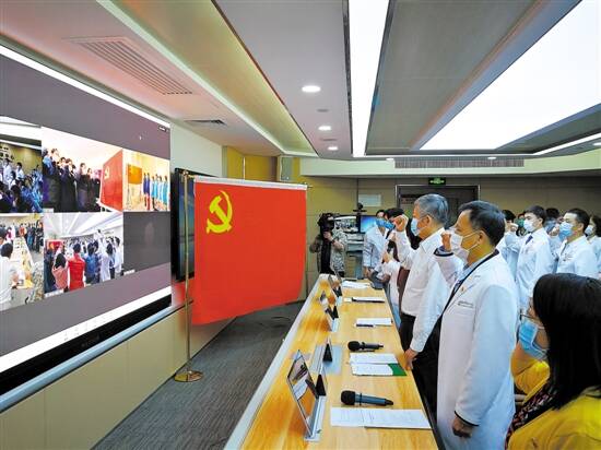 当天,中山一院驰援武汉医疗队14名火线入党的新党员,在中山一院党委书记骆腾的带领下,也面向党旗庄严宣誓。
