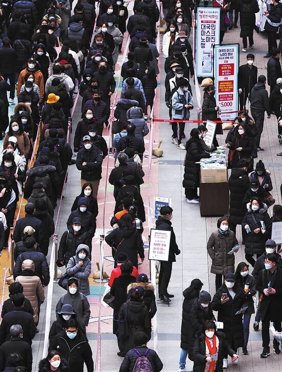 3日,首尔百货商店外排长队购买口罩 新华社发