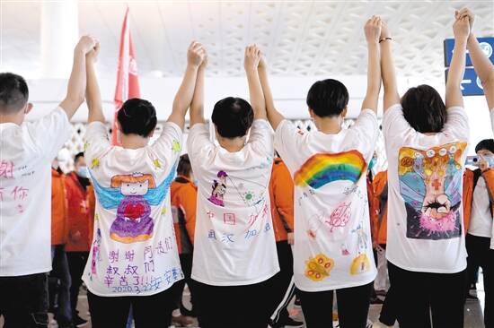 在武汉机场,医疗队中有十多位医疗队员穿着各色各样的手绘T恤格外显眼(上图,汤铭明摄)。原来这是武汉的志愿者组织当地的小学生专门为医疗队员手绘的,每件T恤的图样各不相同,参与手绘的小朋友最小的才三岁半。“昨晚他们把T恤送给我们时,我们很感动,未来会珍藏一辈子。”佛山医疗队员卢健胜说。