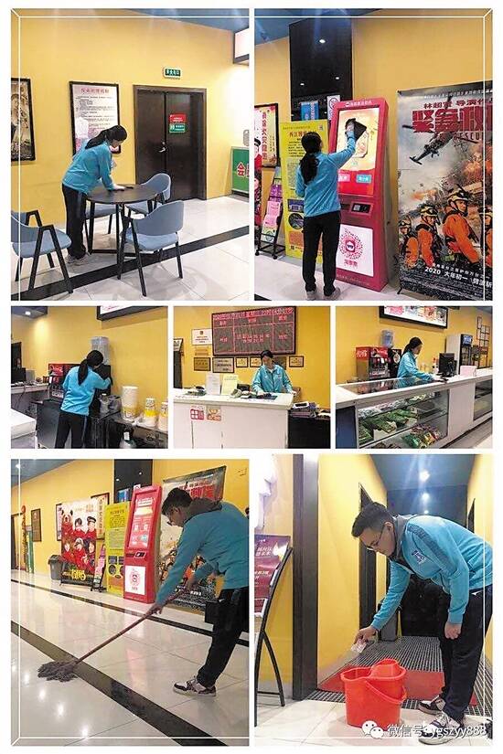 自助取票机触屏、密码键盘等高频接触部位,每小时擦洗消毒一次;卫生间摆放免洗消毒洗手液,每次场间前对卫生间进行清洁消毒一次,对水龙头、门把手、干手机等密集接触区域每半小时喷洒或擦拭消毒液;每日营业前后,对影城全区域进行一次雾化消毒。