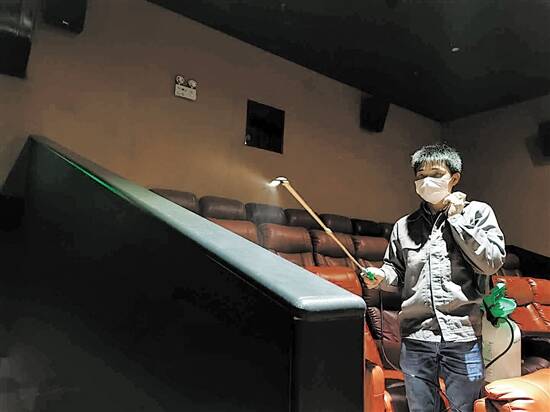 场间时间为20分钟至半小时,保洁人员佩戴手套进行收厅工作并喷洒擦拭消毒,对扶手、座椅把手等直接接触部位重点消毒擦洗;观影全程佩戴防护口罩;复业初期安排观众隔座隔排购票观影,保证安全距离。