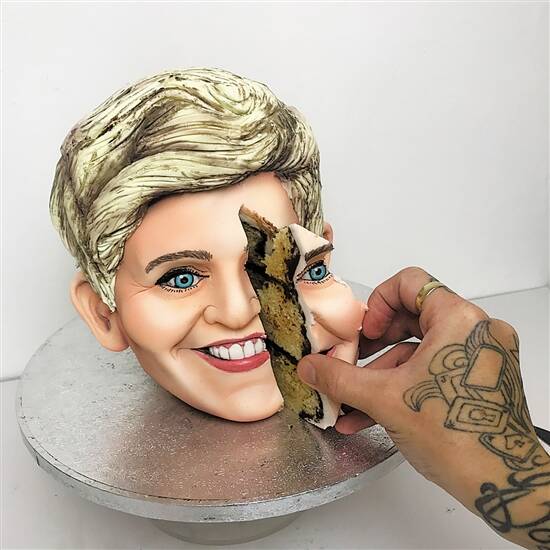 他创作的这些可食用艺术蛋糕,件件令人过目难忘。你可以想象一下,当你在自己的生日派对上与朋友们分享自己的“脑袋”,那是多么难忘的感觉。他因此被电视台邀请去现场表演,也曾为许多位明星、名人定制过蛋糕。