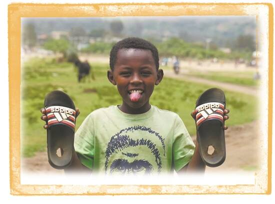 埃塞俄比亚男孩阿布展示自己磨破的拖鞋