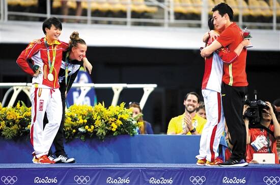 四年前在伦敦,秦凯在最后一跳被逆转,痛失冠军、泪撒赛场,何姿给了男友最温暖的安慰;四年后,何姿接受了秦凯,六年的爱情长跑有了最温暖的结局。二人相拥时,获得冠军的施廷懋和获得季军的意大利选手卡格诺托站在一旁一边笑着一边手搭着肩,这一幕也被许多媒体评为里约奥运最温情的瞬间之一。在这一刹那,成绩早已显得没那么重要,爱和感情与整个世界相通。