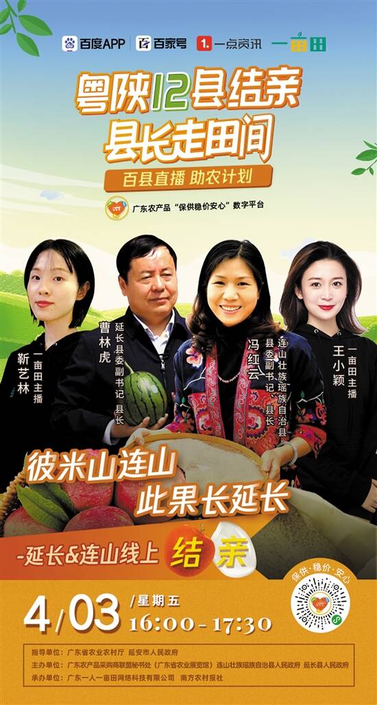 4月3日下午,“粤陕12县结亲 县长走田间”的第二场直播,出场的是陕西延长县县长曹林虎和连山壮族瑶族自治县县长冯红云。