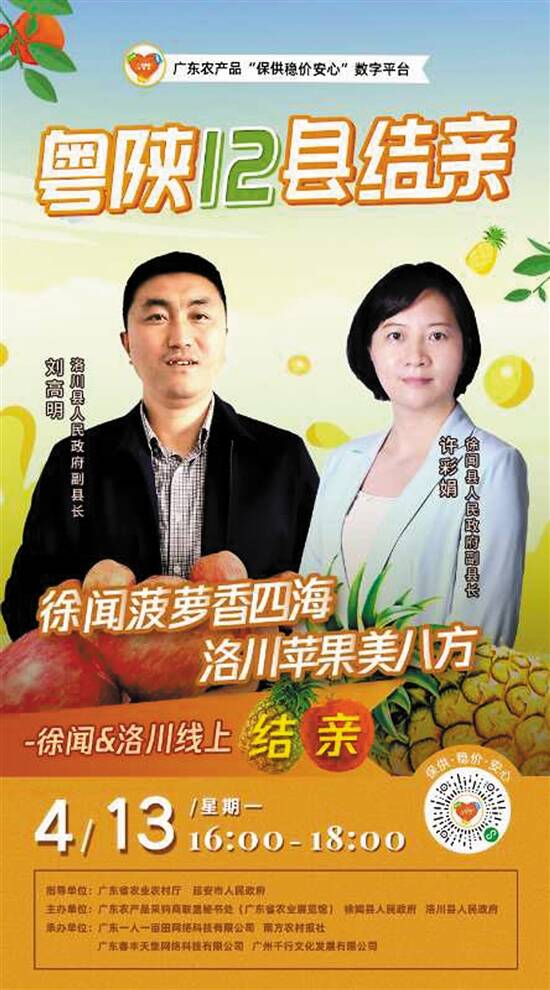在13日下午举行的广东徐闻和陕西洛川专场,网友们在两位副县长的介绍下,知道了“徐闻菠萝香四海、洛川苹果美八方”。