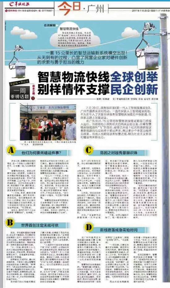 《羊城晚报》持续关注“智慧物流快线”。2017年7月25日曾率先报道