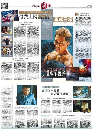谈及表演,胡军表示,自己在演艺道路上一直在寻找可能性:“我演过小人物、大侠、帝王将相……一个演员不要把自己给固定住了,有强项不能舍弃,但还是要更多去尝试。作为一个演员,最关键的一点是真诚。”