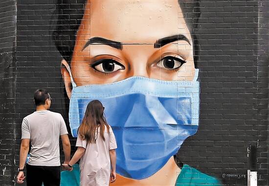 4月26日,伦敦一对情侣从一幅画有戴口罩医护人员的壁画前走过 新华社发