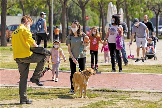 图为4月26日,在西班牙莫林斯德雷,志愿者登记外出散步的儿童及家长的信息。