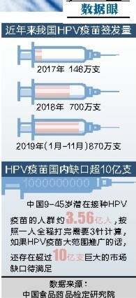 目前,中国9-45岁潜在接种HPV疫苗约3.56亿人。据中国食品药品检定研究院统计数据显示,2017年我国HPV疫苗签发量146万支;2018年为700万支;2019年1月份至11月份为870万支,按照一人全程打完需要3针计算,如果HPV疫苗大范围推广的话,还存在超过10亿支巨大的市场缺口待满足。