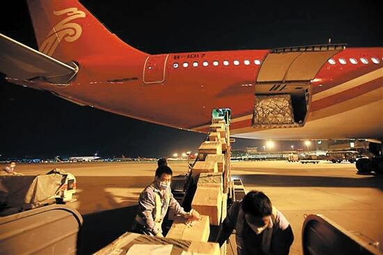晚7点半,367机位。机场地服公司十余名装卸工正在将装满口罩的16个拖卡搬进一架宽体客机的客舱,这架马汉航空的飞机第二天将飞往伊朗首都德黑兰,为当地送去急需的防疫物资。正在现场调度的机场地服工作人员表示,由于近期国际货运包机、“客改货”航班保障任务快速增长,他们专门成立了装卸突击队,一接到支援保障任务,突击队可在30分钟内集合完毕,赶赴指定机位支援物资装机。