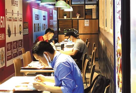 “五一”当天傍晚,在天河区岗顶百脑汇入口,尽管商场保持严格的“体温+健康码”进场防控措施,但依然阻挡不了戴着口罩的市民热情“帮衬”美食门店。“前来就餐的人流量较假期前有了明显提升。”疫情期间,百脑汇六楼某连锁品牌餐厅每天只安排部分员工轮值,面对“五一”假期突增的食客,招待顾客的间隙,当班员工忙得三步并两步小跑起来。不同场景、不同时段的餐饮人气正在重聚,城市里的烟火气已经重新燃起。
