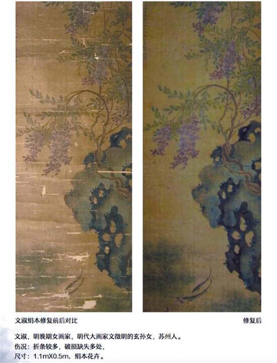 主要修复作品包括北宋崔白的《双喜图》绢本、明代文徵明的《竹兰图》绢本两幅、清代任伯年的《仕女图》绢本、清代画家黄慎六尺纸本两幅(其中包括《苏武牧羊》),以及吴昌硕、齐白石、张大千、徐悲鸿等近代著名书画大师多幅作品。