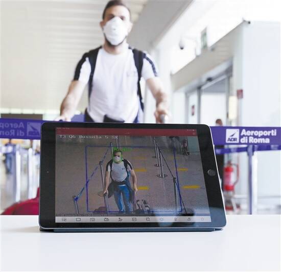 3日,在意大利首都罗马的菲乌米奇诺机场,工作人员监测旅客体温 新华社发