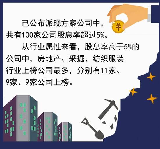 以2019年度的每股派现额及当年末收盘价为基准,对上市公司股息率进行统计发现,已公布派现方案公司中,共有100家公司股息率超过5%。从行业属性来看,股息率高于5%的公司中,房地产、采掘、纺织服装行业上榜公司最多,分别有11家、9家、9家公司上榜。