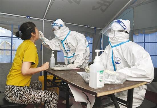 18日,在海淀区区级核酸检测采样点,医护人员为市民进行核酸检测采样
