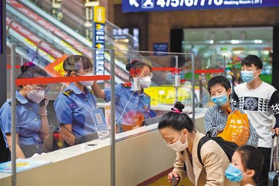 18日,北京站工作人员和旅客隔着透明隔板交流