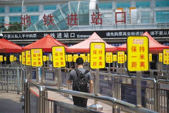 北京站加大防控力度,加强消杀、测温等工作。图为一名旅客走进北京站地铁站入口