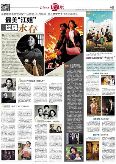 在电影《烈火中永生》里塑造了经典角色“江姐”的著名电影表演艺术家于蓝,于6月27日晚在北京逝世,享年99岁。