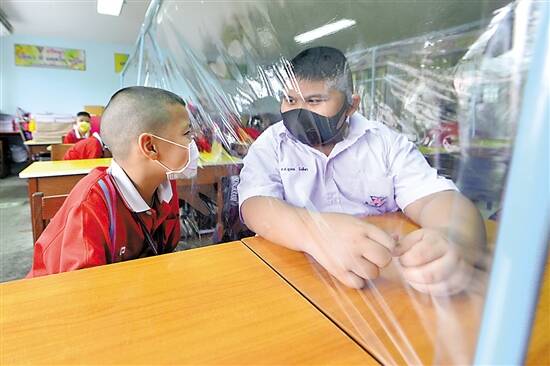 7月1日,泰国曼谷一所小学的学生在教室里隔着防护膜聊天。当日,泰国中小学生开学复课 新华社发