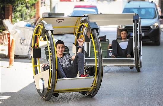 土耳其布尔萨的街头,最近出现了一种审美独特的两轮电动车。看上去,它更像是一种类似游乐场里的玩具车,因此它一出现在路上,总是回头率颇高。这种两轮电动车还分单人座与双排座两种型号。车身以两个巨大的车轮为主,上方还有一块可遮风挡雨的挡板,看上去还颇为舒适。它的设计者是一个名叫Hasan Duman的年轻人,萌生灵感后,他便和亲戚朋友们商量着如何生产出这种方便出行的工具,最后,在大家的帮助下,才有了这批两轮电动车的诞生。一大家人集体开着这种车出游,也的确是件场面热闹非凡的事。