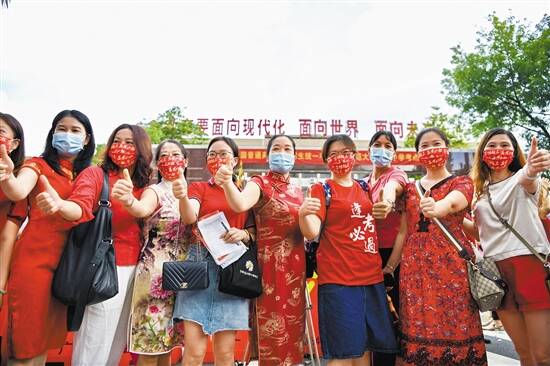 执信中学送考的家长们大多穿着年级统一订制的红色“壮行服”,有着开门红、鸿运当头的好意头。一位外婆穿了旗袍来送自己的外孙,她说三年前她就是穿着这件幸运的旗袍送外孙中考,外孙考上了执信,今天她再次穿着这件旗袍送考,希望外孙能考上心仪的大学。