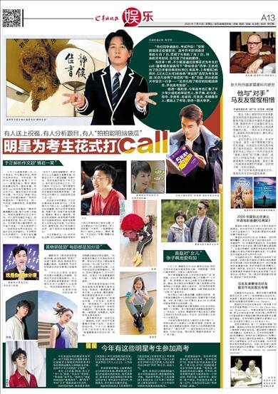 与往年一样,不少明星通过微博花式为考生打call:潘粤明在扇面写下“静候佳音”四字;王凯晒出了自己手拿经典资料书《5年高考,3年模拟》的照片,以《大江大河》的角色“宋运辉”造型为考生加油;吴亦凡使用了微信的“拍一拍”功能,晒出的图片中显示一行字——“吴亦凡拍了拍你的聪明脑袋瓜,并说高考加油”。