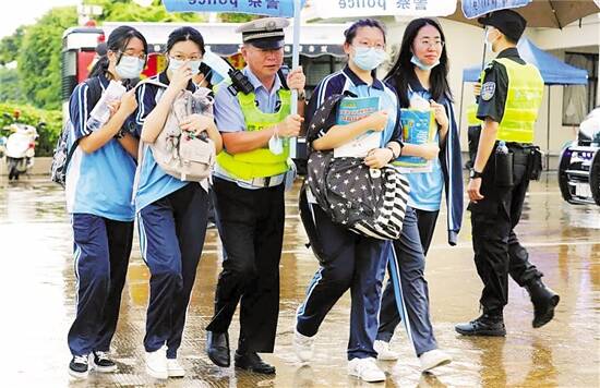 珠海交警用大伞雨中护送考生 何叶舟 摄