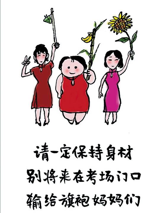 “这是她们对内心焦虑、紧张和压力的一种释放。”高考期间,随着妈妈们的“行为艺术”一同走红的,还有“跨界漫画家”林帝浣为上述场景创作的漫画作品《举葵图》(见上图)。画中,穿着红色旗袍、胖瘦程度各异的三位女性站在一起,带着笑颜举起上述物品。他为漫画配文——“请一定保持身材,别将来在考场门口输给旗袍妈妈们”。