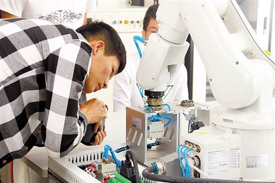 华夏职院实训中心内,学生认真探究工业机器人的厉害之处