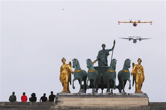 7月14日,法国国庆节阅兵式致敬抗疫公民,人们观看飞机表演 新华社发
