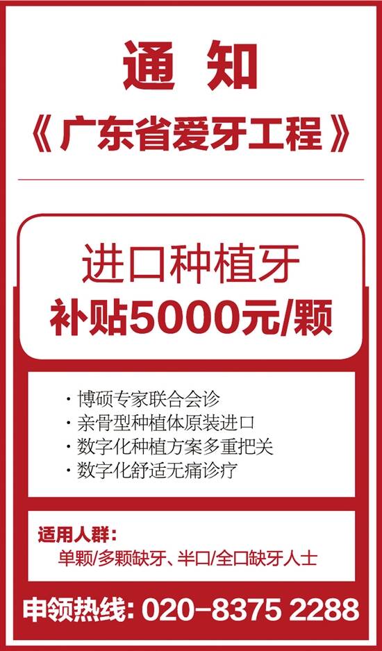 “广东省爱牙工程”是由广州广播电视台“G4出动”栏目组主办、广东省临床医学学会协办、广东省老年基金会为指导单位,德伦口腔为承办单位及唯一技术指定单位的援助活动,为让更多市民“看好牙,易看牙”,推出系列补贴政策,拨打020-8375 2288申领补贴:
