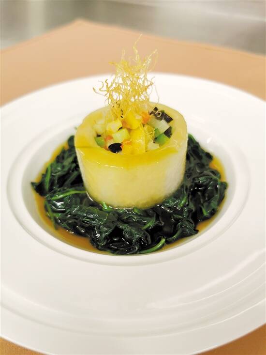 而另外一款“翠田种玉”则专为素食爱好者而设,用高汤煨软的冬瓜环,里面盛满先用镬爆香的鲜爽木耳、黄耳、雪耳、青椒、黄椒、红椒、芦笋粒,而衬底是餐厅当天最鲜嫩软滑的绿叶时菜,可以是辣椒叶、苋菜、芝麻菜、枸杞叶……上桌之前浇一小勺超浓缩秘制上汤、顶上撒一小撮香脆提神的炸姜丝,虽是全素,口感却十分丰富,味道鲜爽香甜。