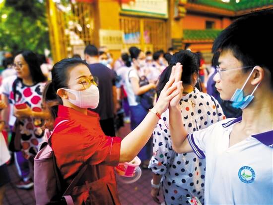 今早,广州市第十三中学门前,击掌鼓劲 羊城晚报记者 陈辉 摄