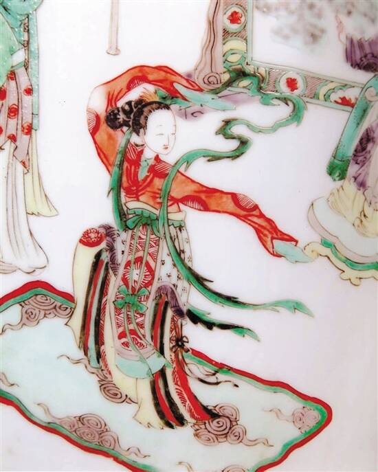 过去瓷器上出现的仕女,大都简单满足于整体形似,对于容貌五官的细节并不讲究。这些仕女大多出现在一些大场景之中,对于观者而言,像是站在远处窥盼倩影,其颜色之美,则在似有还无中。