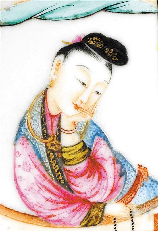 而自清代以来,瓷器上的仕女长相变得精致起来,画工更讲究五官的比例和眉目发髻的细节,以呈现女性的美丽姿容。或者构图上,将视点近景聚焦在一位女性的身上,特写她的撩人仪态和娴静容貌,让人仿若身处其侧,遂得将红颜仔细打量。