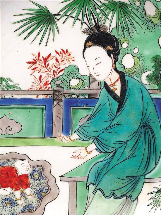 清康熙 五彩仕女婴戏图盘(局部)