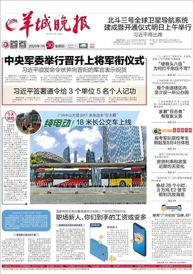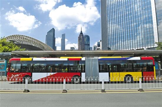 羊城晚报讯 记者严艺文、通讯员公交宣报道:广州市民可乘坐全新“巨无霸”公交车了!30日上午,身披“七巧板”外衣的18米长纯电动公交车在广州中山大道BRT试验线正式投入运营。据悉,本次上线的“巨无霸”纯电动公交车共36台,全部在B1线运营。