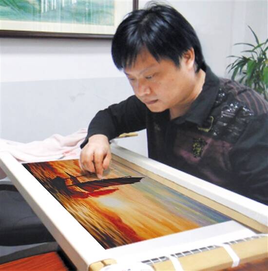 每年春节是谭展鹏最忙的时候。“忙于尝试新时尚的融入,我们这一行没有休息的时候。”在谭展鹏看来,设计是工艺美术界最大的难题。他认为,设计部分为减少成本,工序由繁不断变简,是中国工艺美术目前的困境。“传统的广绣作品全面跌出了社会需求圈,导致产能严重过剩,资金链经受严重的考验。”面对行业现状,谭展鹏一直在思考出路。