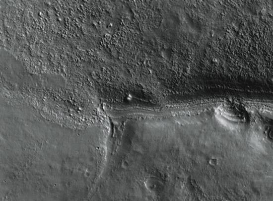 HiRISE传回的另一张图片则让我们看到一层层明暗交错的岩石,按比例推算约有1公里宽。另一种这种层状地形在火星峡谷中也很常见,HiRISE拍摄的高分辨率图像可以让我们看到一簇簇的“同心圆”,圆的中心暴露出更深层的岩层,但目前人类还不知道它们是怎样形成的。