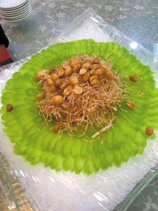 鸿福的冰镇大顶凉瓜是在方形玻璃盘里放满冰块,然后用保鲜膜将盘子与冰块裹住,在冰面铺上晶莹剔透的大顶凉瓜薄片,中间放上炸芋头丝、花生、酸荞头、芝麻做搭配。李锦强表示,他们之所以加这些配料,是要强调这道菜并不是餐前小吃,而是主菜,要给食客传递冰凉清爽的感觉,希望他们能留下深刻印象,记住佛山大沥这一著名特产。