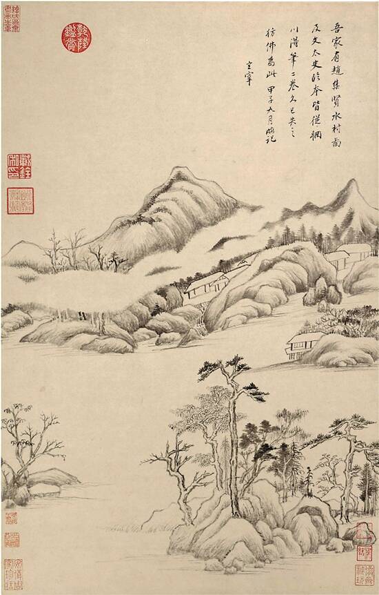 董氏山水,得静、润、和、淡诸长,这等境界为前辈沈周、文徵明所不及。这幅《水村图》可以说是冲淡一品的典型作品,于荒寒之致外,多一种简古朴拙之美。董氏本人说是仿赵孟頫的《水村图》,但与现藏故宫博物院的赵孟頫原作横卷《水村图》相比较,就会觉得董作更见笔墨的抒情性。