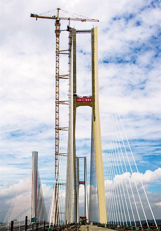 此次合龙的跨西江斜拉桥位于广东省江门市境内,全长1117.5米,属钢箱混合双主梁结构,主跨跨径600米,设两座H形桥塔,塔高分别为208米和200米,共有96对斜拉索,是广州南沙港铁路项目重难点控制性工程,也是全线施工难度最大、安全风险最高的工点之一。