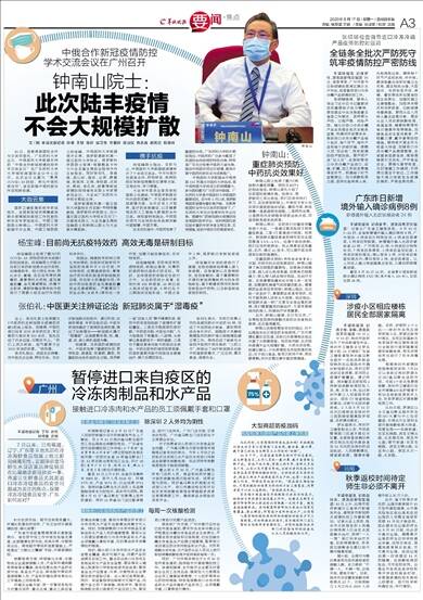 钟南山在接受媒体采访时指出,对于汕尾陆丰近日报告的本地病例,广东对疫情处置反应迅速,目前已对疫情相关地区开展了大规模筛查。他总体判断,此次陆丰疫情不会大规模扩散,大家无须恐慌。他建议群众,少去疫情发生风险较高的地区;对于进口食品,食用之前洗干净,烹饪要煮熟;另外还需注意平复恐慌情绪。